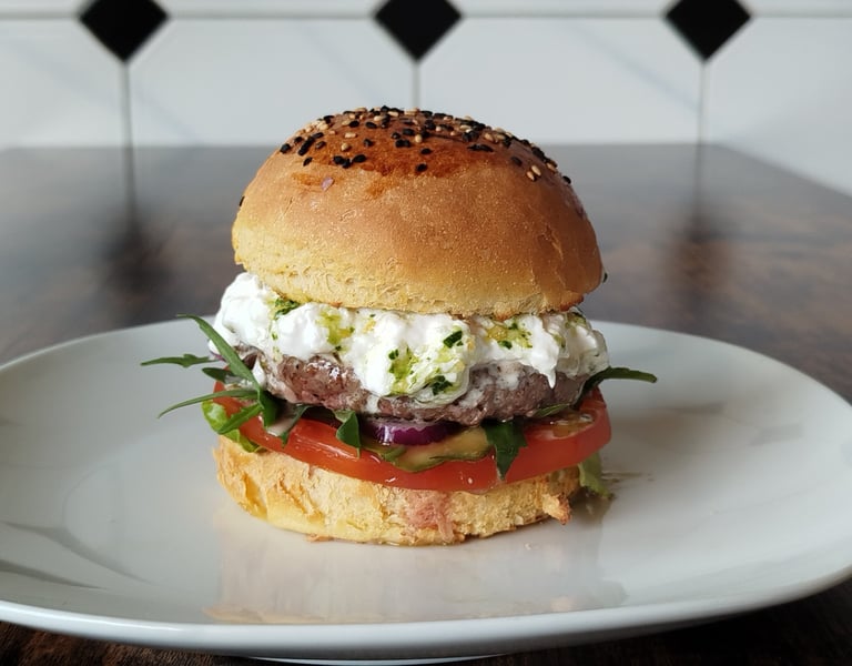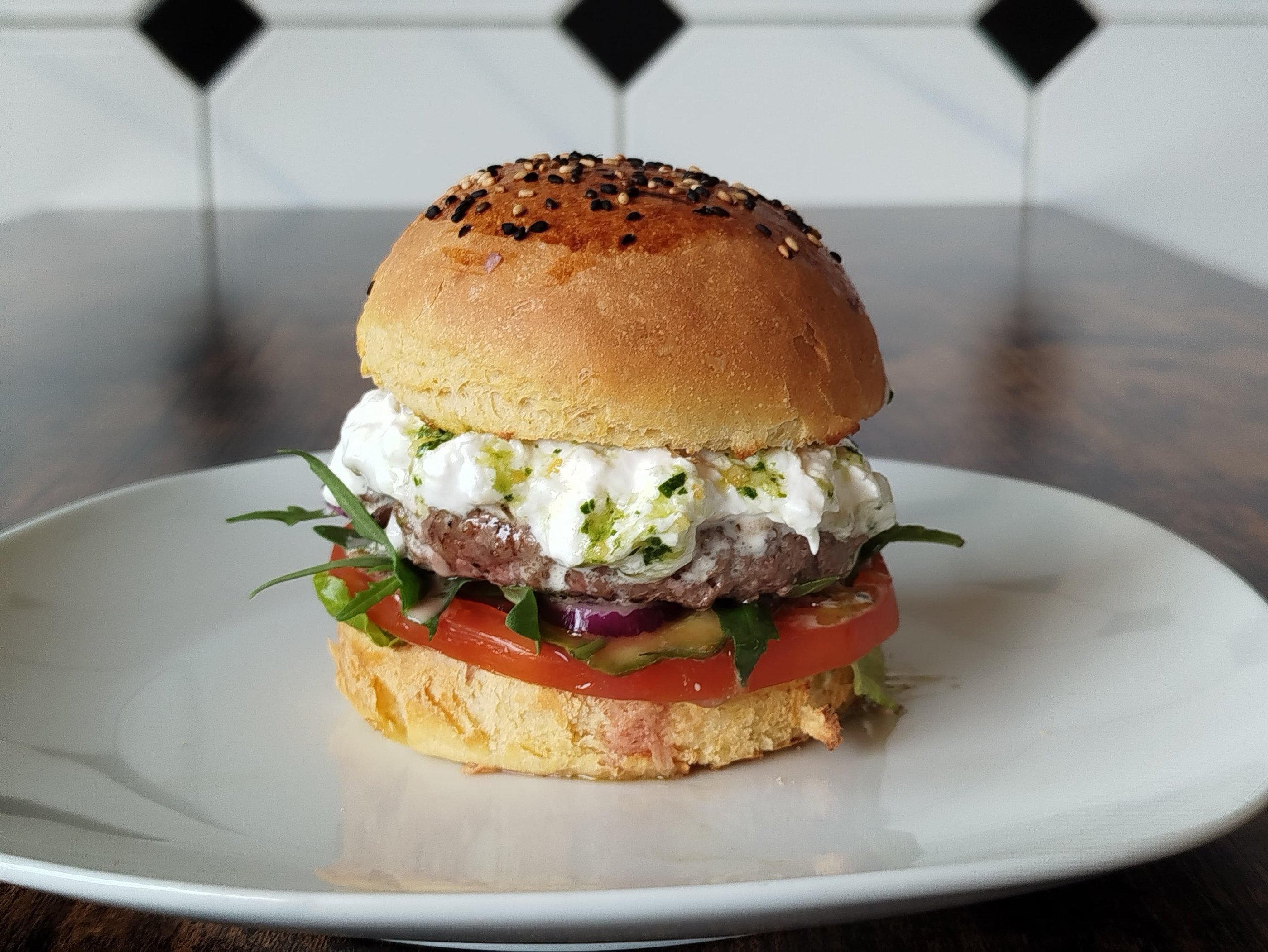 mit saftigem Rinderpatty, cremigem Büffelburatta, Basilikum-Pesto, Salat, Tomaten, Gurken, roten Zwiebeln und Rucola