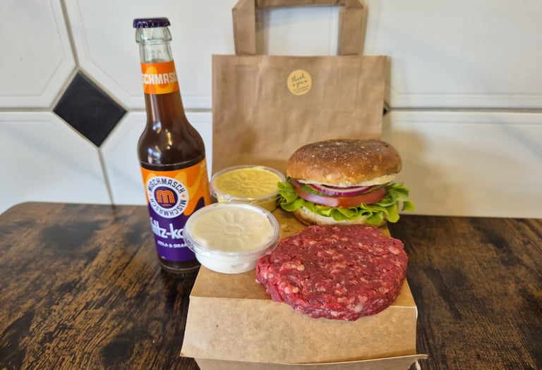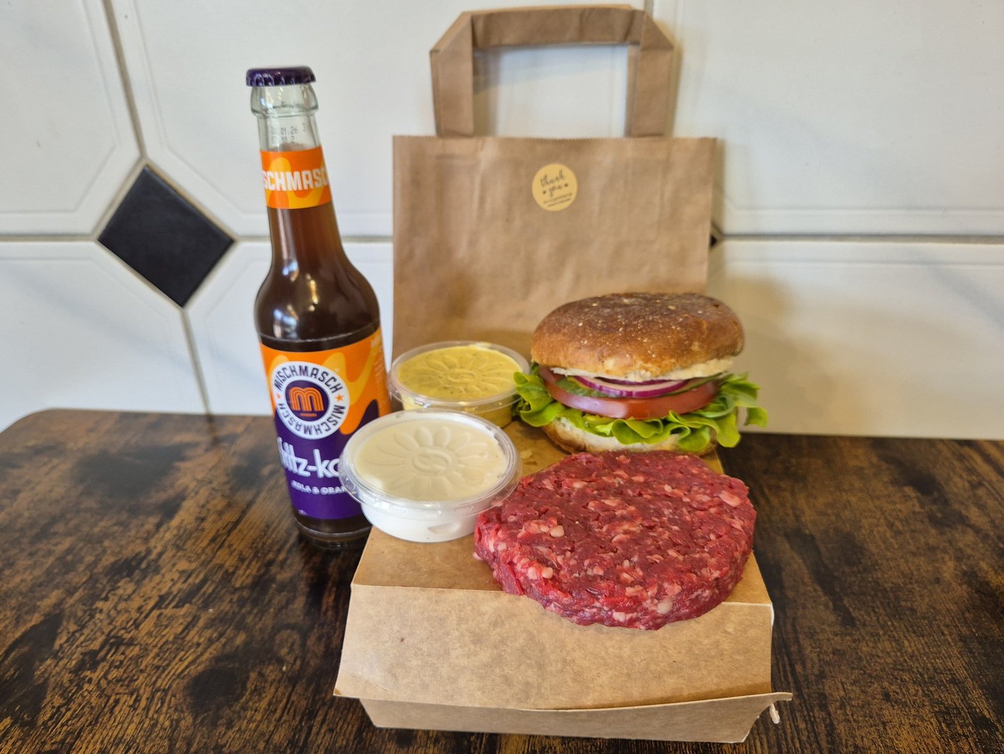 Bestellt einen Tag im Voraus und wir stellen euch alle Zutaten für euren Burger zusammen – wahlweise mit Rinderpatty oder Veggie Patty. Eine kurze Anleitung zur Zubereitung gibt’s dazu und schon wirst du zum Burgerchef. Extrawünsche erfüllen wir gerne gegen Aufpreis. Preis pro Burger: 6,50 €
