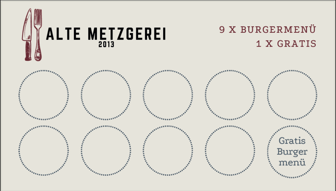 Treue wird belohnt! Hol dir unsere 10er-Treuekarte und genieße deine Lieblingsburger – mit einem besonderen Bonus: Für jedes Burgermenü, das du bei uns kaufst, bekommst du einen Stempel. Hast du 9 Stempel gesammelt, gibt es das 10. Burgermenü gratis!
